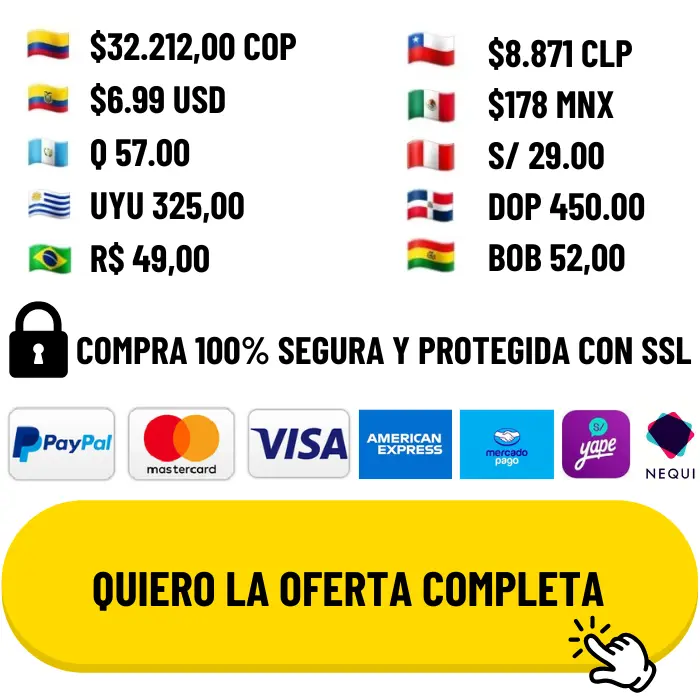 DA CLIC AL BOTÓN PARA VER EL PRECIO EN TU MONEDA LOCAL Y RECIBE AUTOMÁTICAMENTE TODO LO ANTES MENCIONADO AL HACER LA COMPRA. ¡HAZLO ANTES DE QUE EL RELOJ MARQUE CERO Y REGRESE EL PRECIO ORIGINAL!
